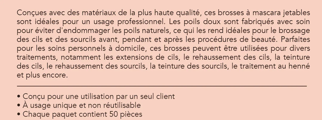 Conçues avec des matériaux de la plus haute qualité, ces brosses à mascara jetables sont idéales pour un usage professionnel. Les poils doux sont fabriqués avec soin pour éviter tout dommage aux cheveux naturels, ce qui les rend idéales pour le brossage des cils et des sourcils avant, pendant et après les procédures de beauté.