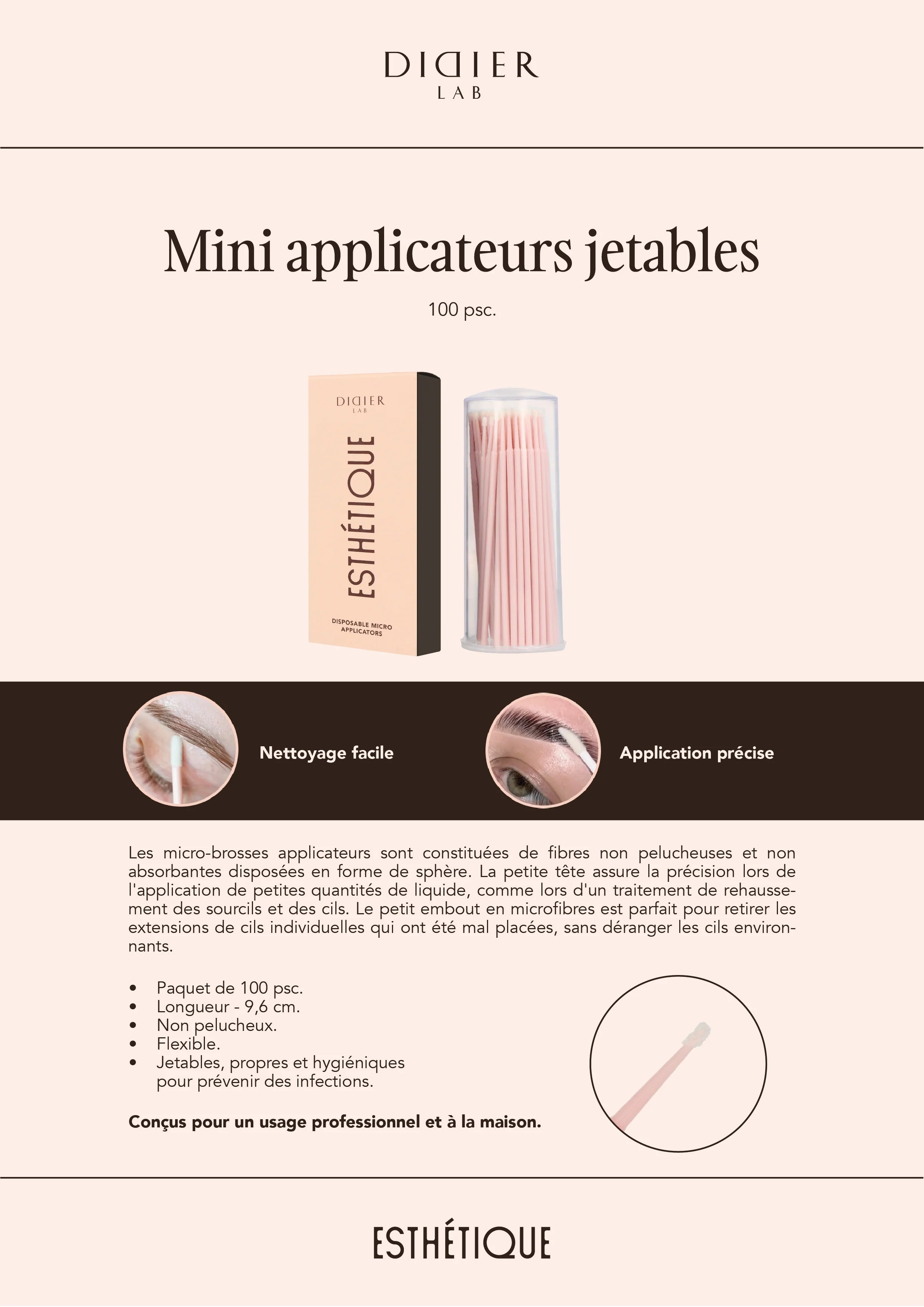 Les micro-brosses applicateurs sont constituées de fibres non pelucheuses et non absorbantes disposées en forme de sphère. La petite tête assure la précision lors de l'application de petites quantités de liquide, comme lors d'un traitement de rehaussement des sourcils et des cils. Le petit embout en microfibres est parfait pour retirer les extensions de cils individuelles qui ont été mal placées, sans déranger les cils environnants.