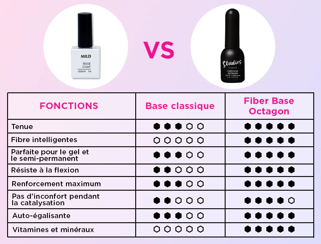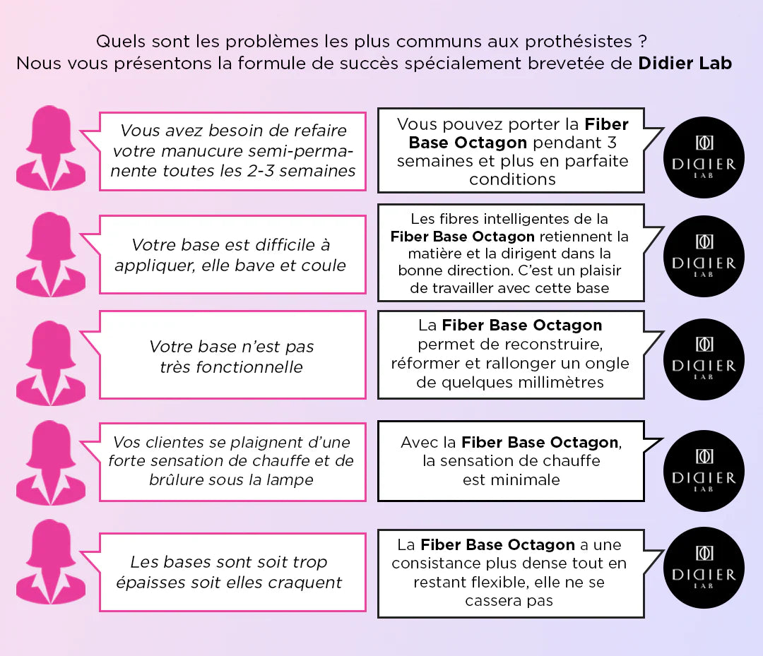 La formule de la base Studios Didier Fiber Octagon est riche en Vitamine E et en Calcium ainsi qu'en fibres synthétiques de verre et nylon. Elle a été créée pour répondre aux demandes et défis les plus rencontrés tels que :