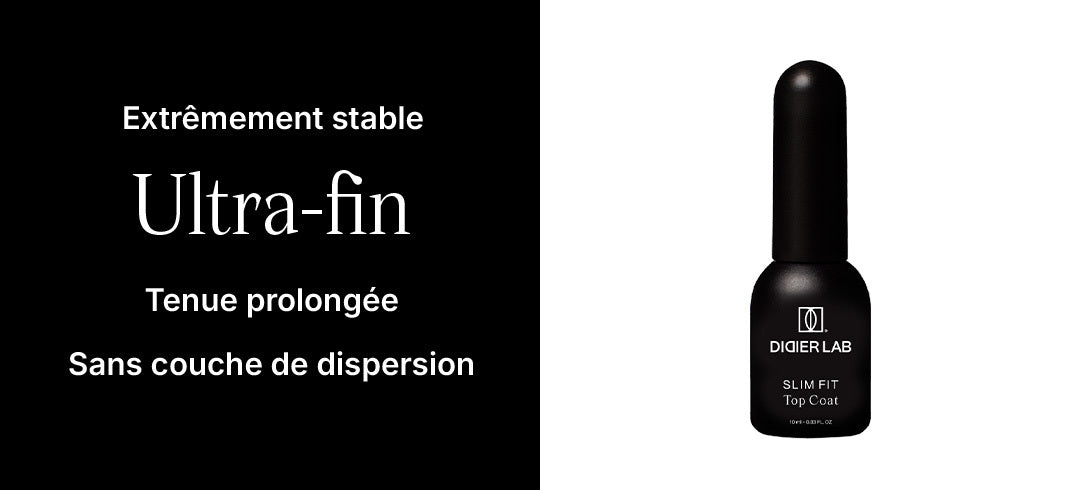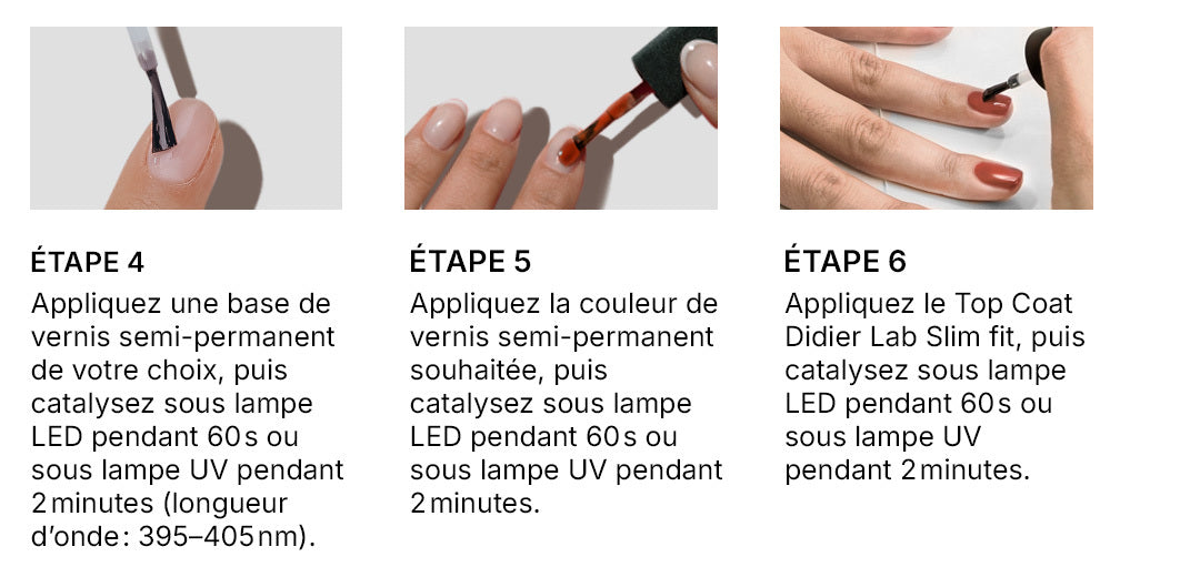 - Appliquer le Top Coat Slim Fit de Didier Lab et polymériser sous une lampe LED pendant 60 secondes ou une lampe UV pendant 2 minutes.