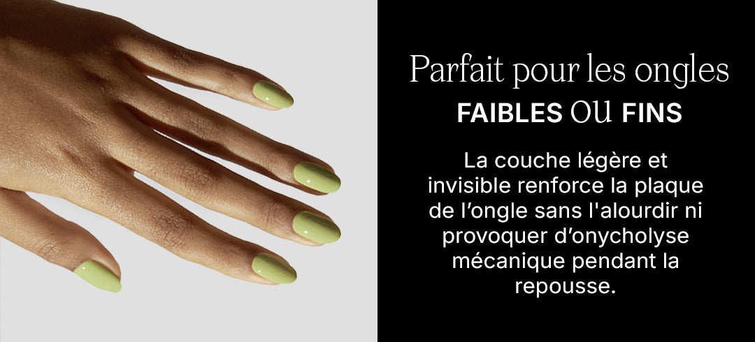 - Fournit une couche protectrice durable, mais presque invisible, qui empêche les ongles de se casser ou de se dédoubler