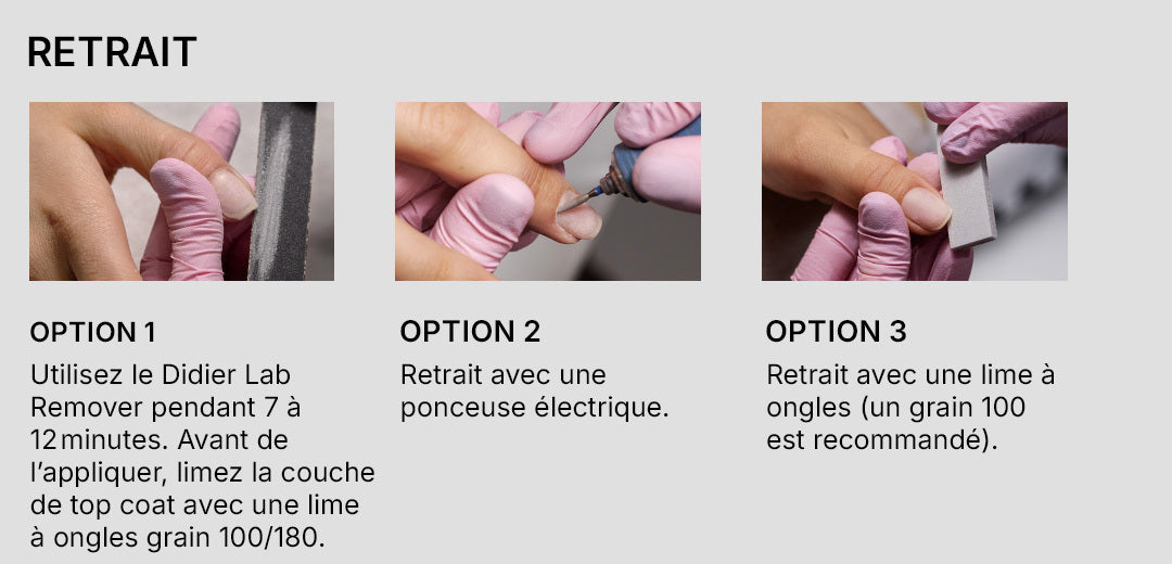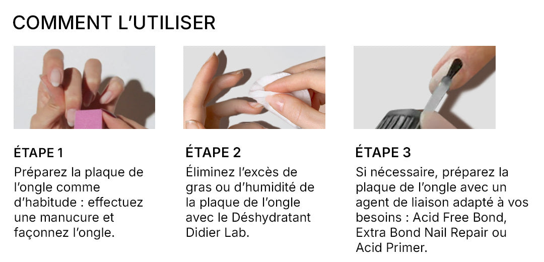 - Éliminer l'excès de gras et d'humidité de la plaque des ongles à l'aide du Déshydratant Didier Lab.