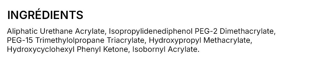 Ingrédients : Aliphatic Urethane Acrylate, Isopropylidenediphenol PEG-2 Dimethacrylate, PEG-15 Trimethylolpropane Triacrylate, Hydroxypropyl Methacrylate, Hydroxycyclohexyl Phenyl Ketone, Isobornyl Acrylate.