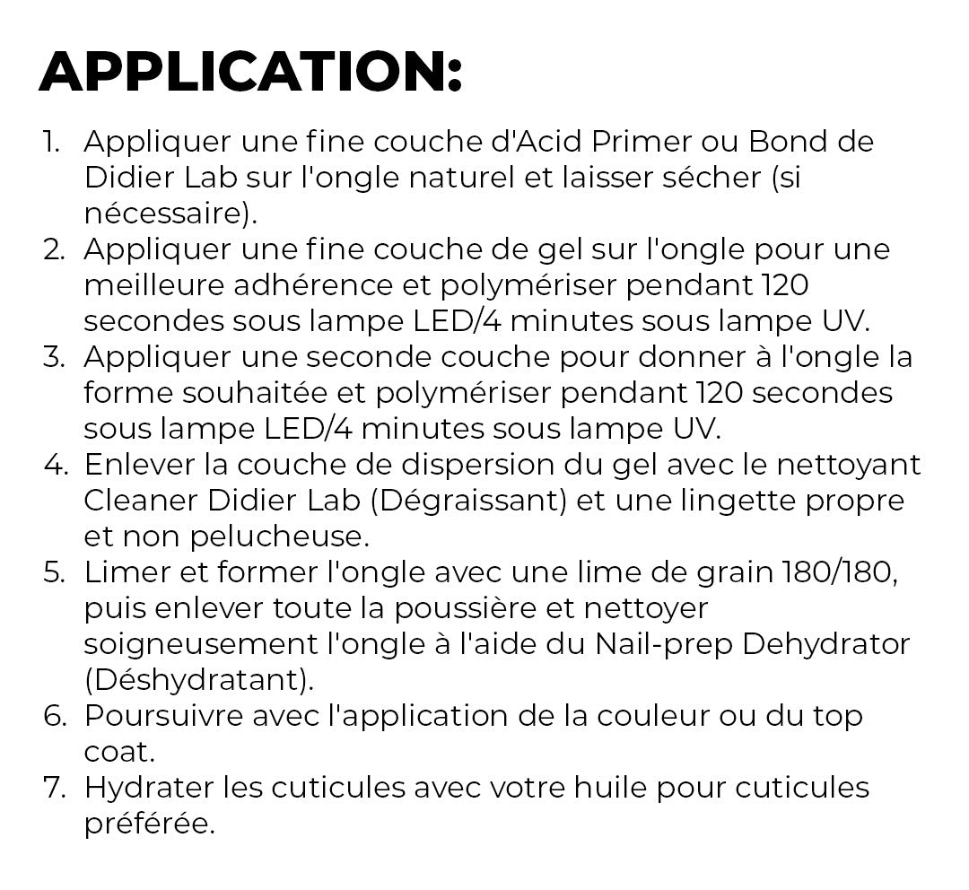 - Appliquer une fine couche d'Acid Primer ou Bond de Didier Lab sur l'ongle naturel et laisser sécher (si nécessaire).