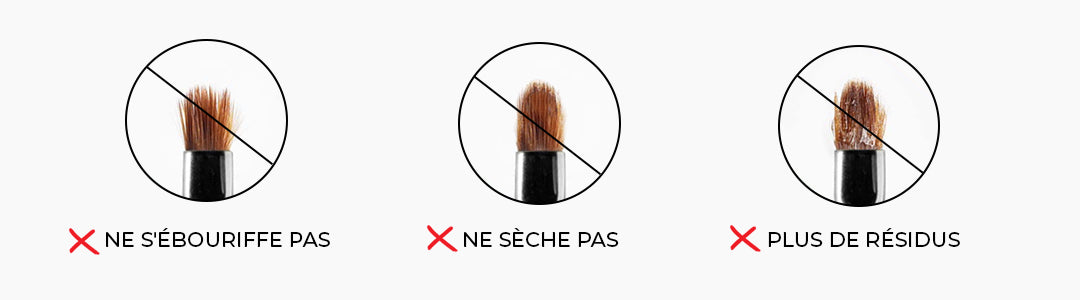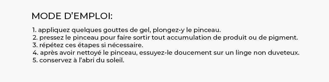 - Rapide et facile à utiliser : Appliquez quelques gouttes de gel, immergez le pinceau et appuyez doucement pour éliminer tout ancien matériau ou résidu de pigment accumulé. Répétez l'opération si nécessaire.