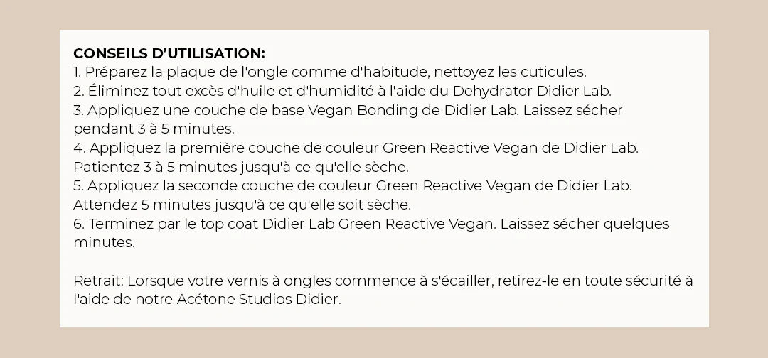 Retrait : Lorsque votre vernis à ongles commence à s'écailler, retirez-le en toute sécurité à l'aide de notre Acétone Studios Didier.